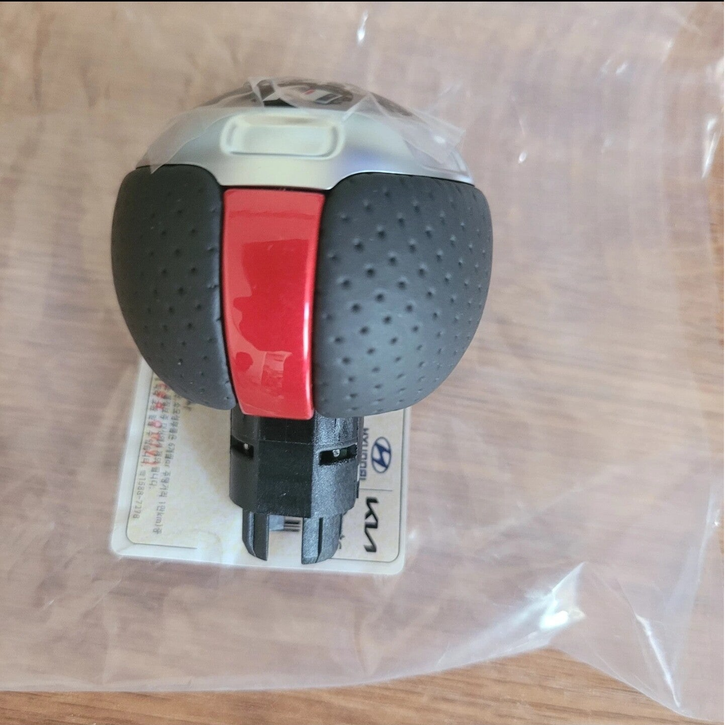 Brand-new perforated leather gear knob with red accent for the manual I30N, in stock and ready to ship.